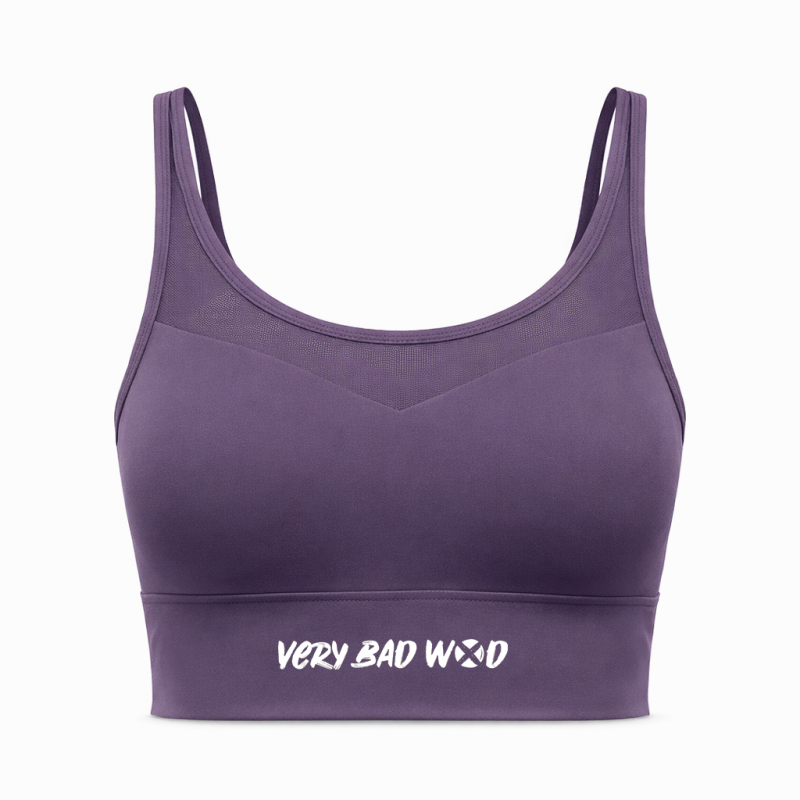 Cette brassière violette NANCY coupe légèrement échancrée avec une bordure en mesh respirante sur l'avant et croisé derrière. Le logo VERY BAD WOD est présent en blanc sur l'avant de la brassière.