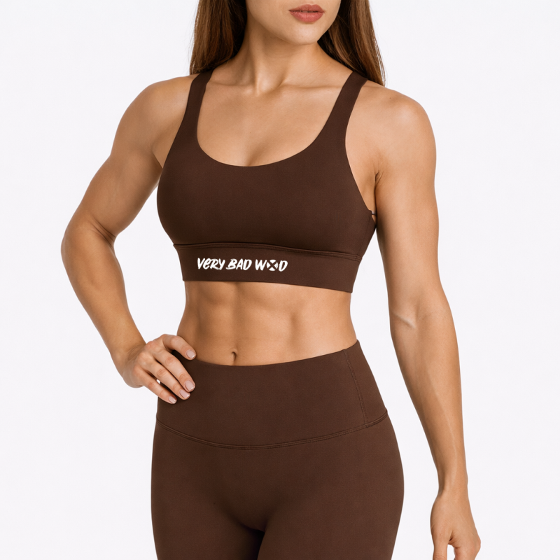 Cette brassière marron ISABEL coupe arrondie avec le logo VERY BAD WOD présent en blanc sur l'avant de la brassière.