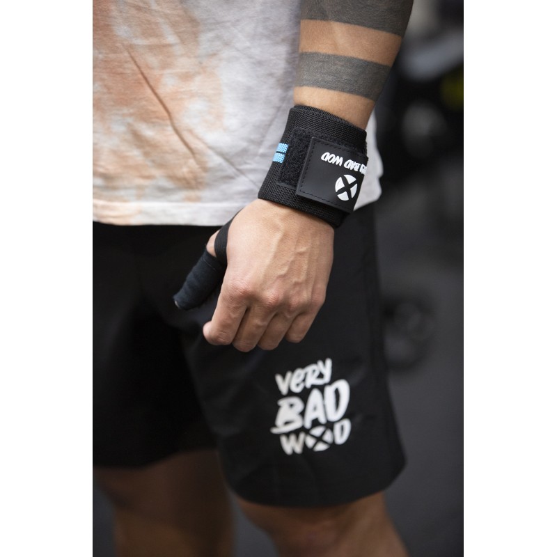 Ces Bandes de poignets élastiques coloris noir avec 2 bandes bleures au centre proposées par VERY BAD WOD seront un accessoires indispensable à votre entraînement.