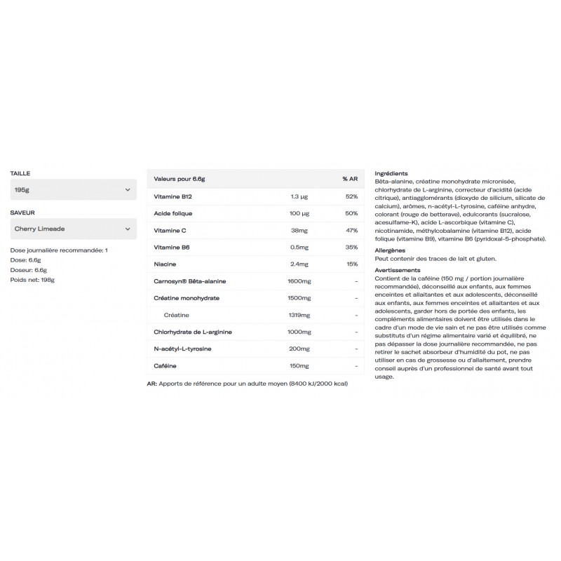 Mix 1 scoop (6.6 g) with 150-200 ml of water and consume 20 to 30 minutes before training. Each tub contains 30 servings, perfect for a full month of regular workouts or to give your performance a targeted push.